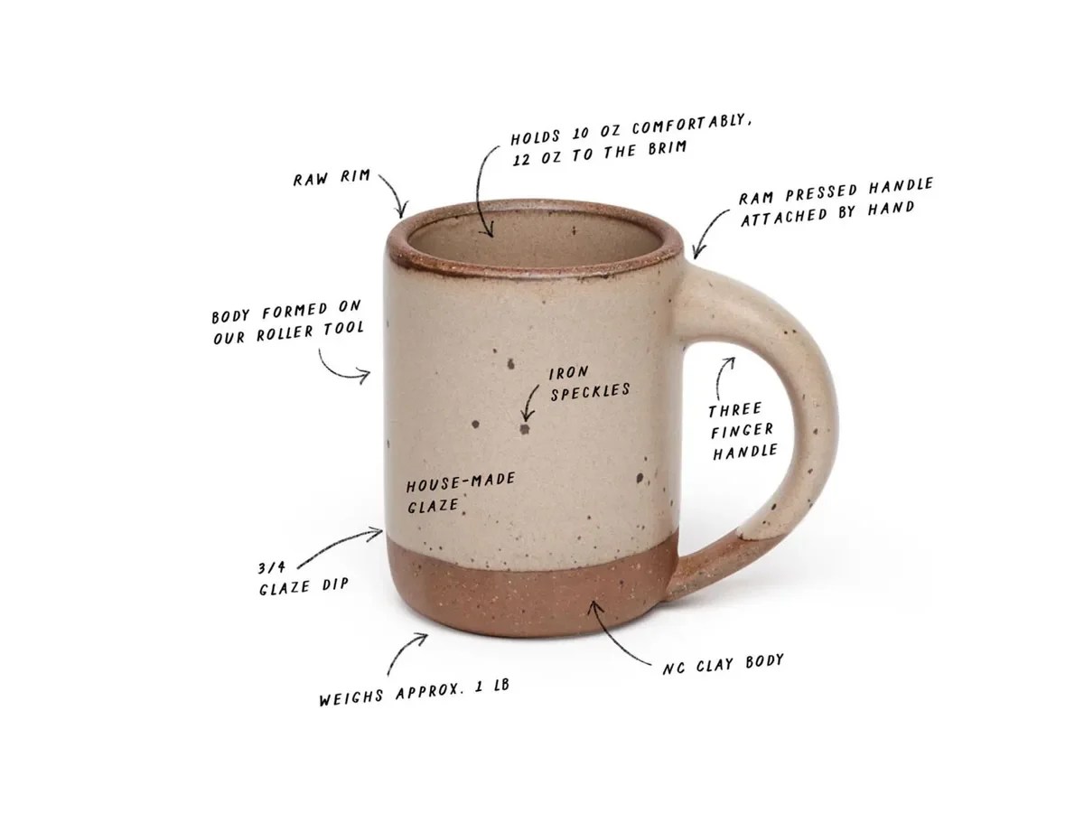 - The Mug: The OG, the gateway to East Fork, and a daily essential. Dimensions: 4.25″ x 3.1″; Weight: 16 oz; Holds 12 oz to the brim.