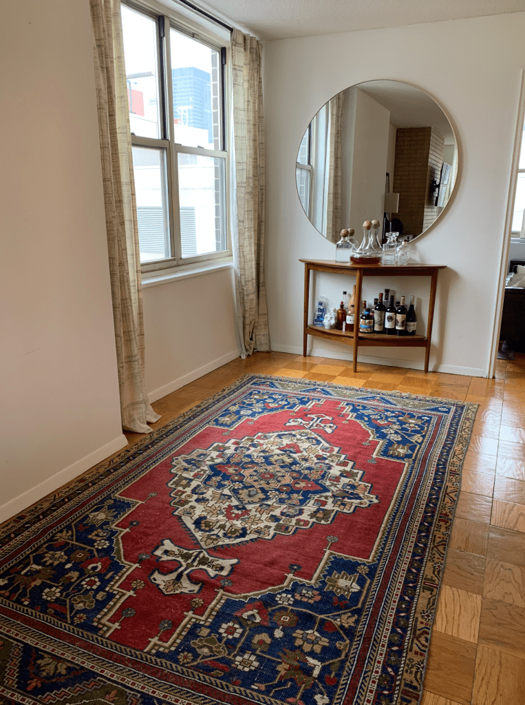 I got lucky – it didn’t take long before I stumbled across a rug called Billee. It was the perfect dimension for what we needed, its dark colors hid any spills, and its Turkish Wool made it extremely durable. It was also vintage and complimented our newly bought table and lighting in a way that gave the room a level of approachable comfort rather than an “I’m new don’t touch me” vibe.
